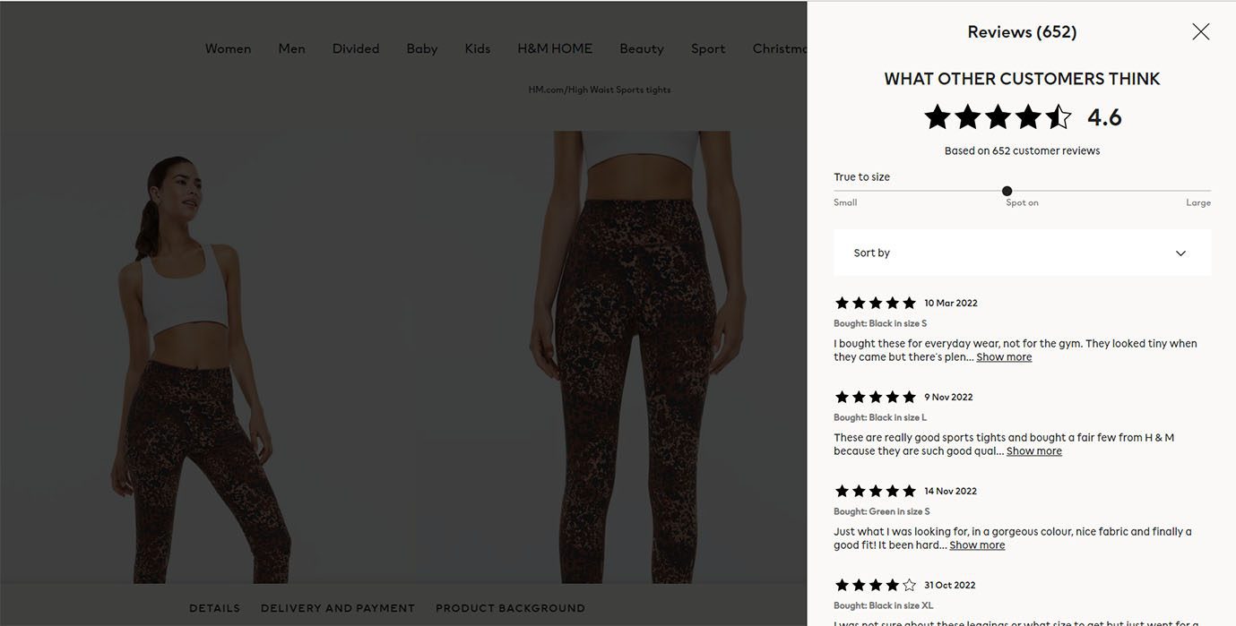 Make sure to state what makes the item unique and what it’s used for, but don’t leave out key specifications such as shape, size, weight or colour. In addition to these parameters, you can also add customer reviews to the product, just like H&M does.