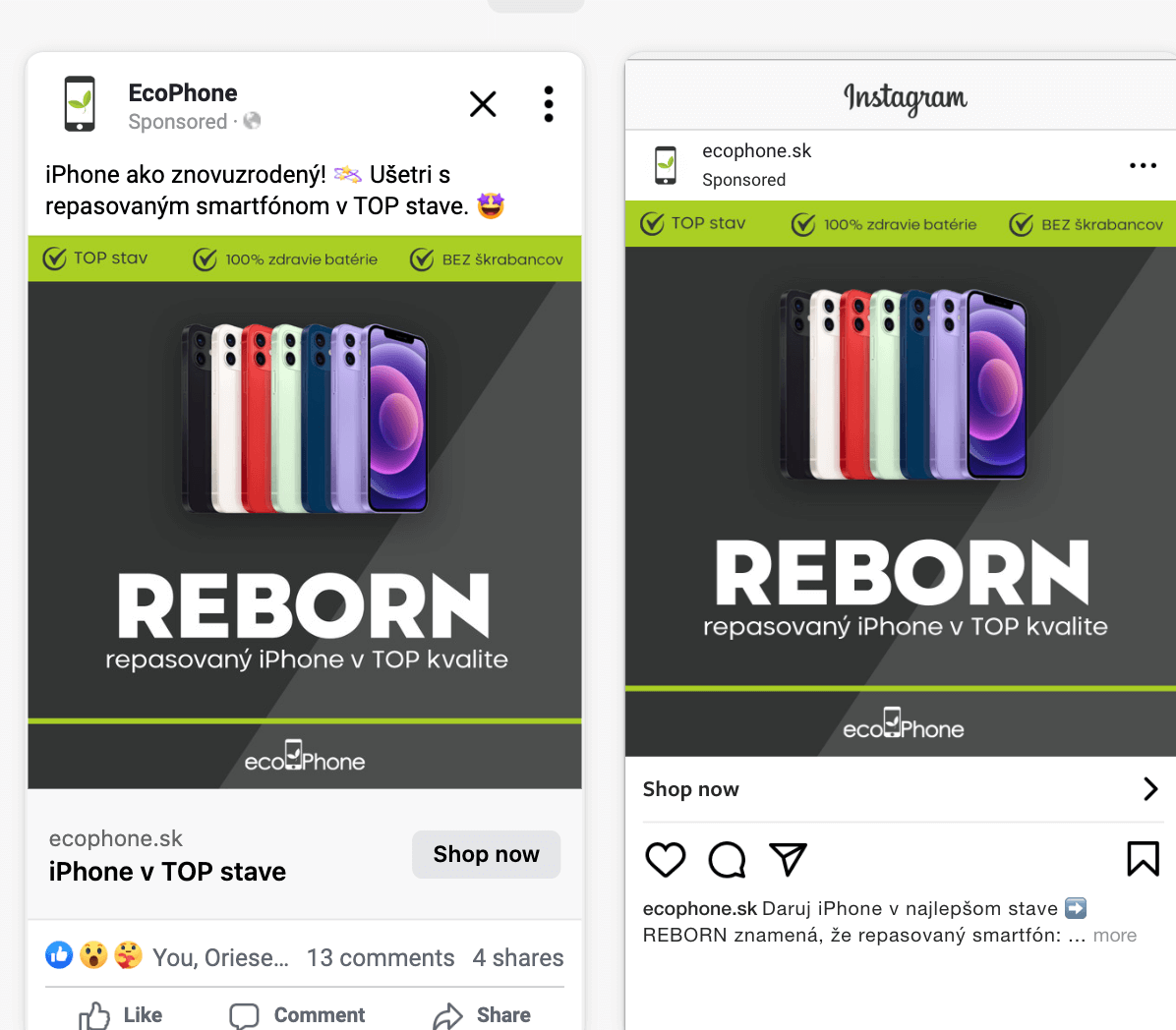 Together with the client, we realised that we must to focus on another target group – people who want a new phone. We needed to show them that a new iPhone is not the only pathway to a quality phone. That they can be more ecological and if they don’t want the latest model, they can buy a powerful, refurbished iPhone with a brand new battery for less money.