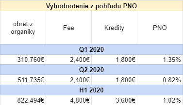 Naším hodnotiacim faktorom je v tomto prípade PNO (podiel nákladov na obrate) aj z dôvodu jednoduchého porovnania s inými kanálmi.